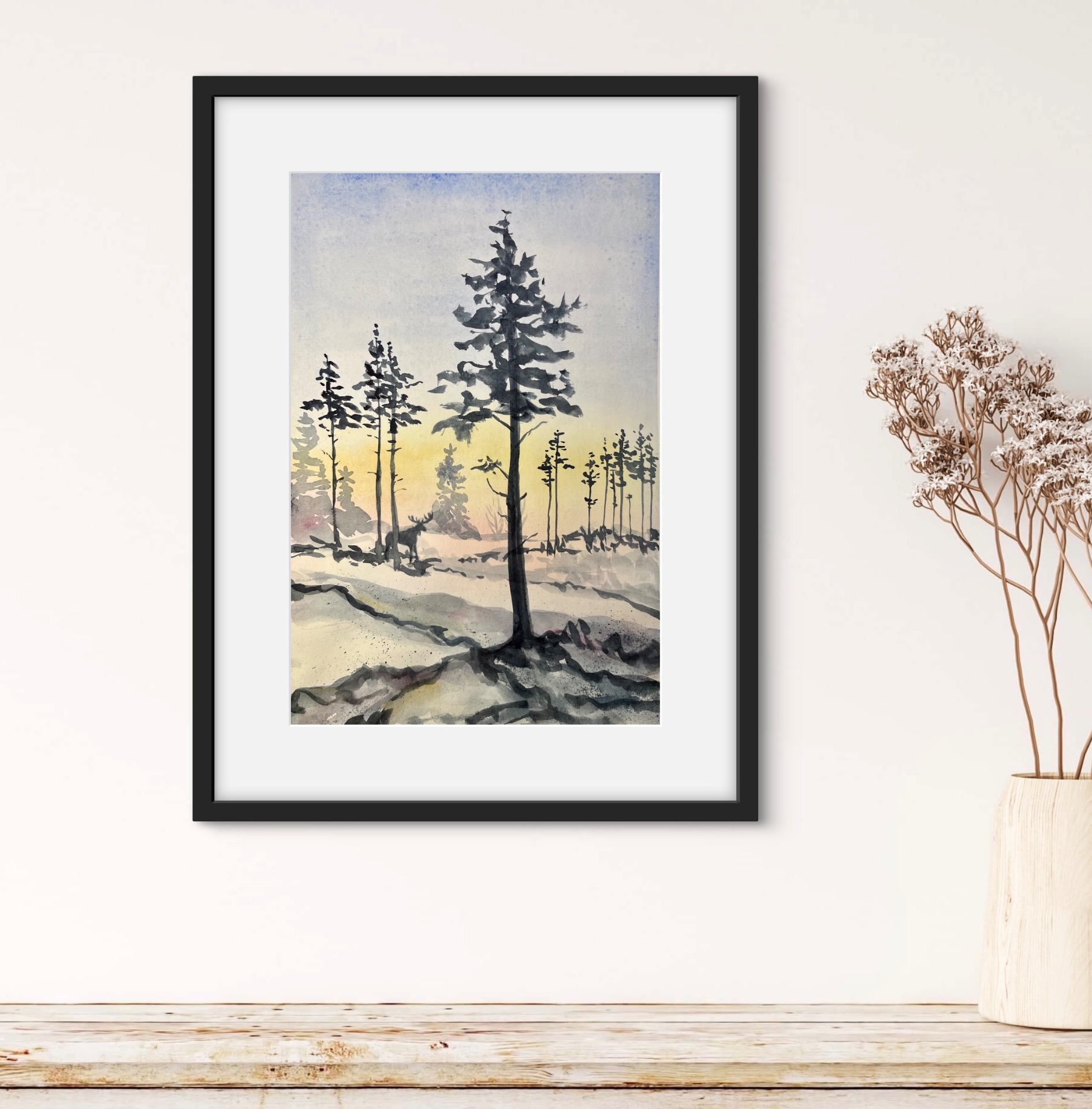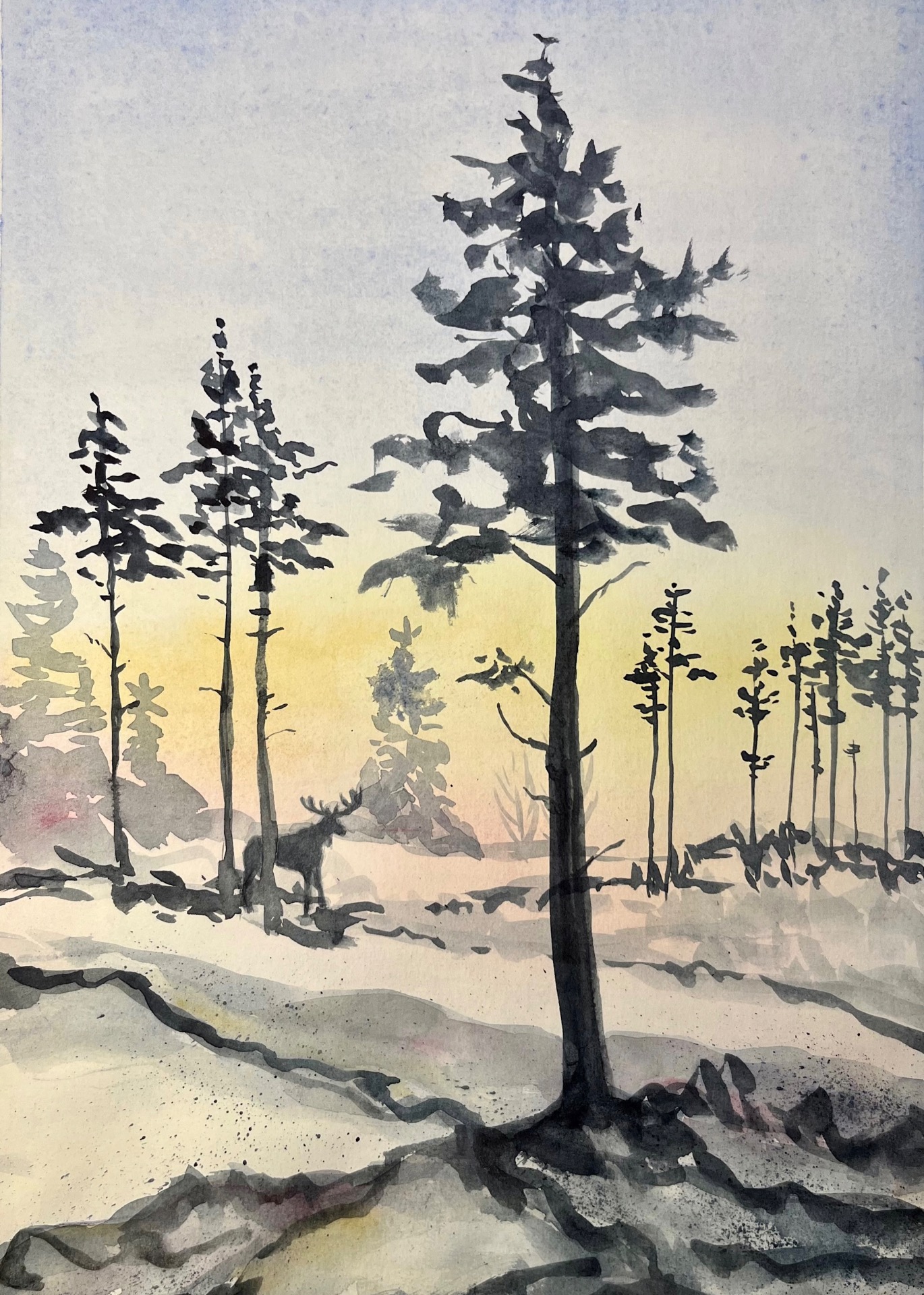 Ett vintermotiv med solen som ligger lågt och en älg som avvaktar lite längre bort.