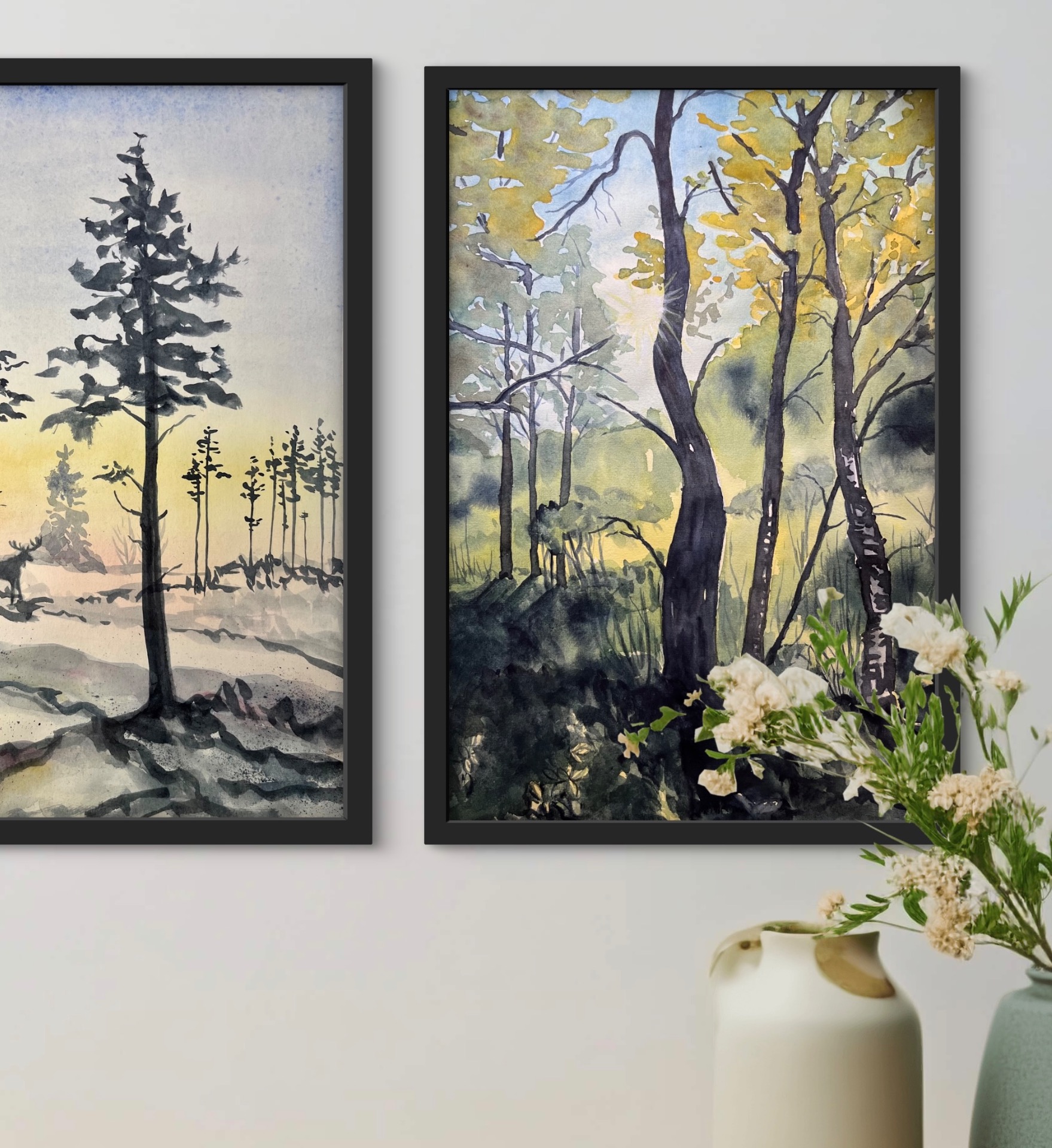 Monterad med passaepartout och svart träram i storlek 40x50 cm.