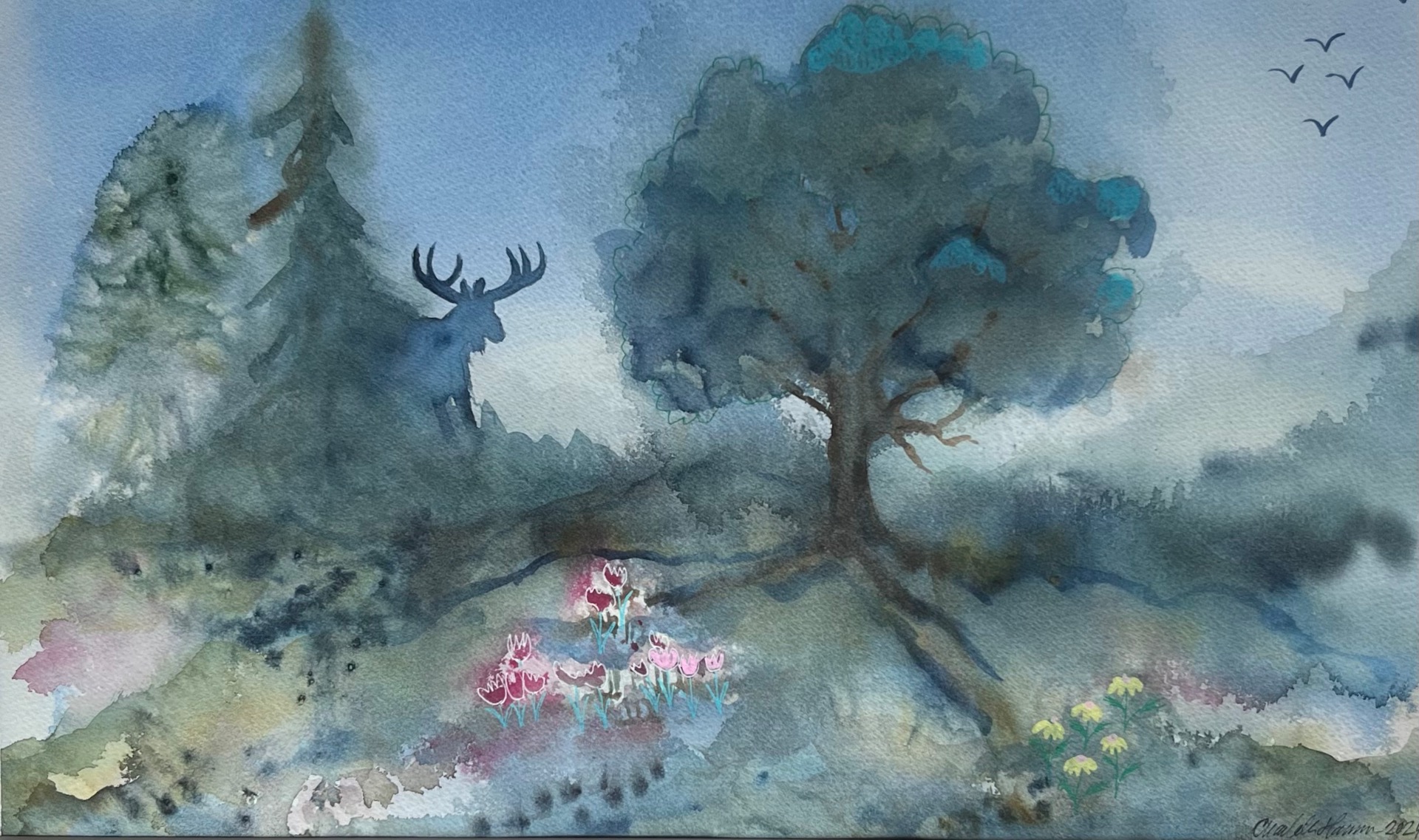 Landskap med älg i sin skog. Målat på kraftigt akvarellpapper i 425g