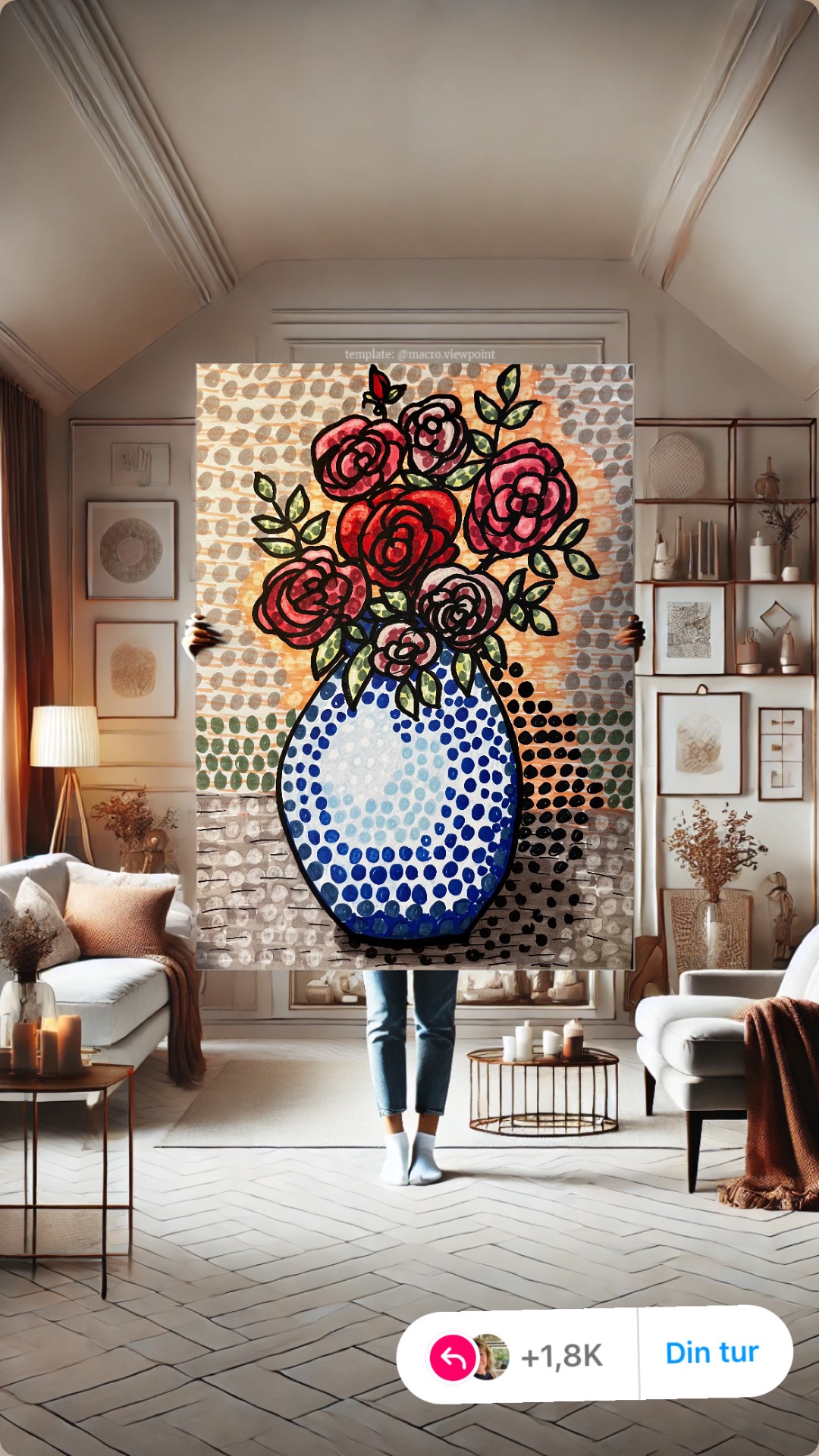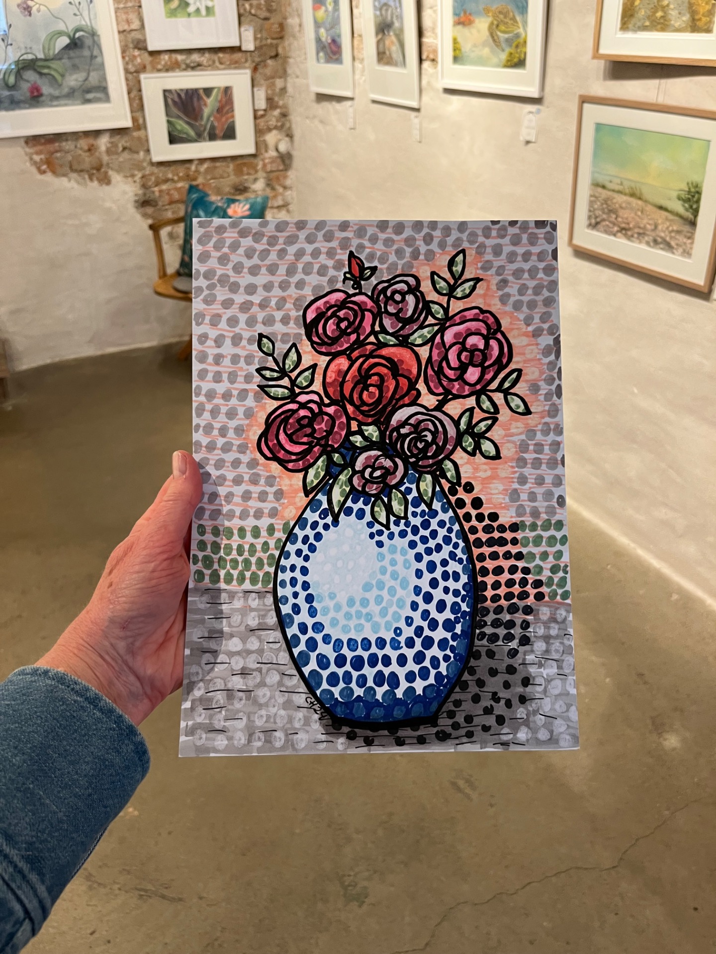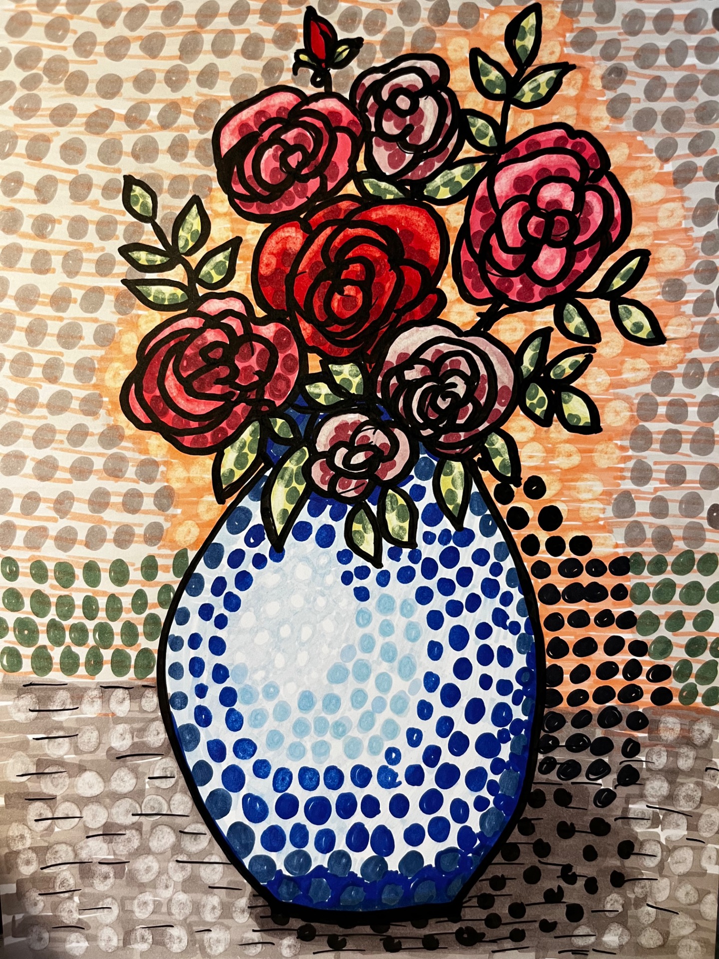 Den fina vasen med grattisblommorna. Målad med coloured markers, tuschpennor. Storlek A4