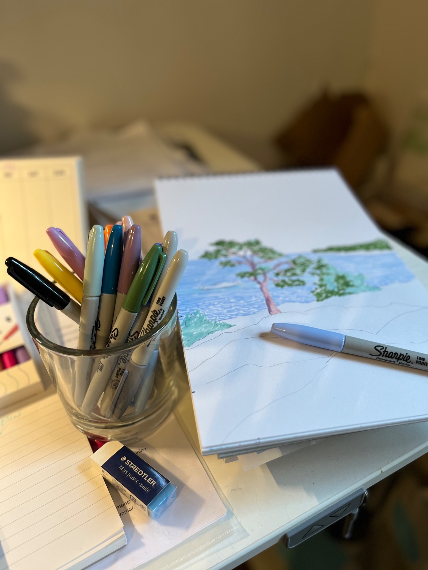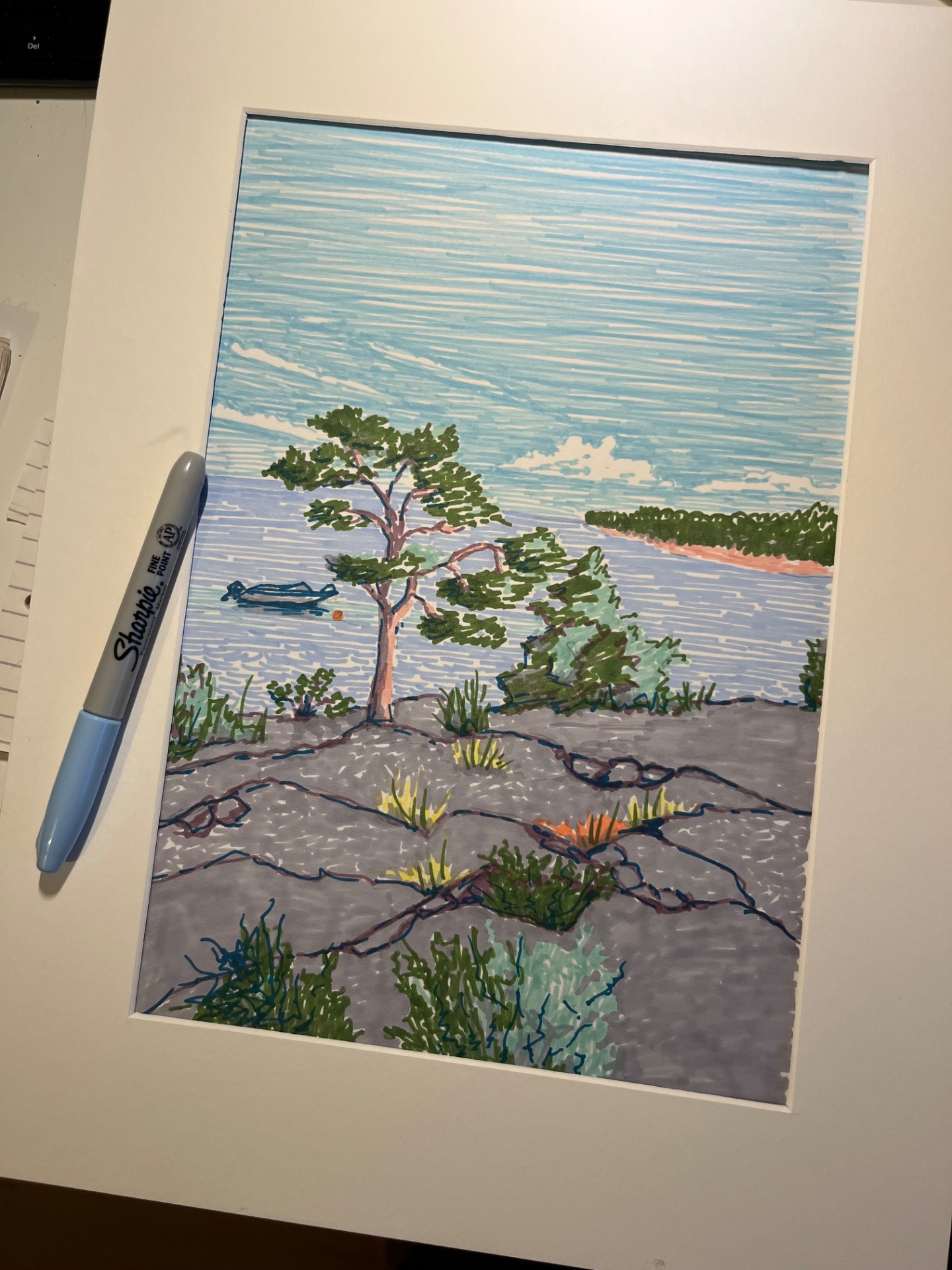 Tuschmålning med klipporna och de låga tallarna på Sandhamn en fin sommardag. Målad med coloured markers, tuschpennor. Storlek A4